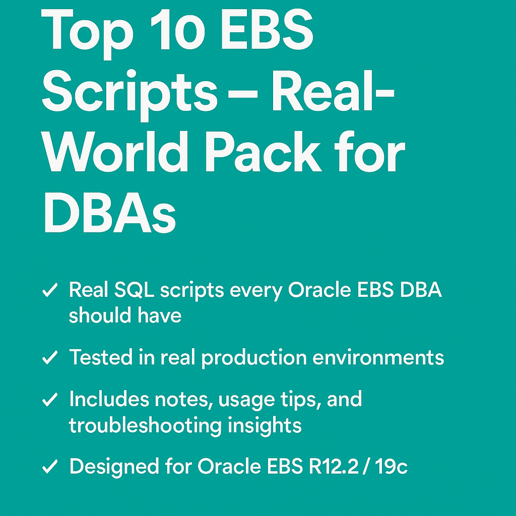 This pack is perfect for Oracle DBAs working on EBS R12.2 or 19c who need reliable SQL scripts for patching, monitoring, and troubleshooting.